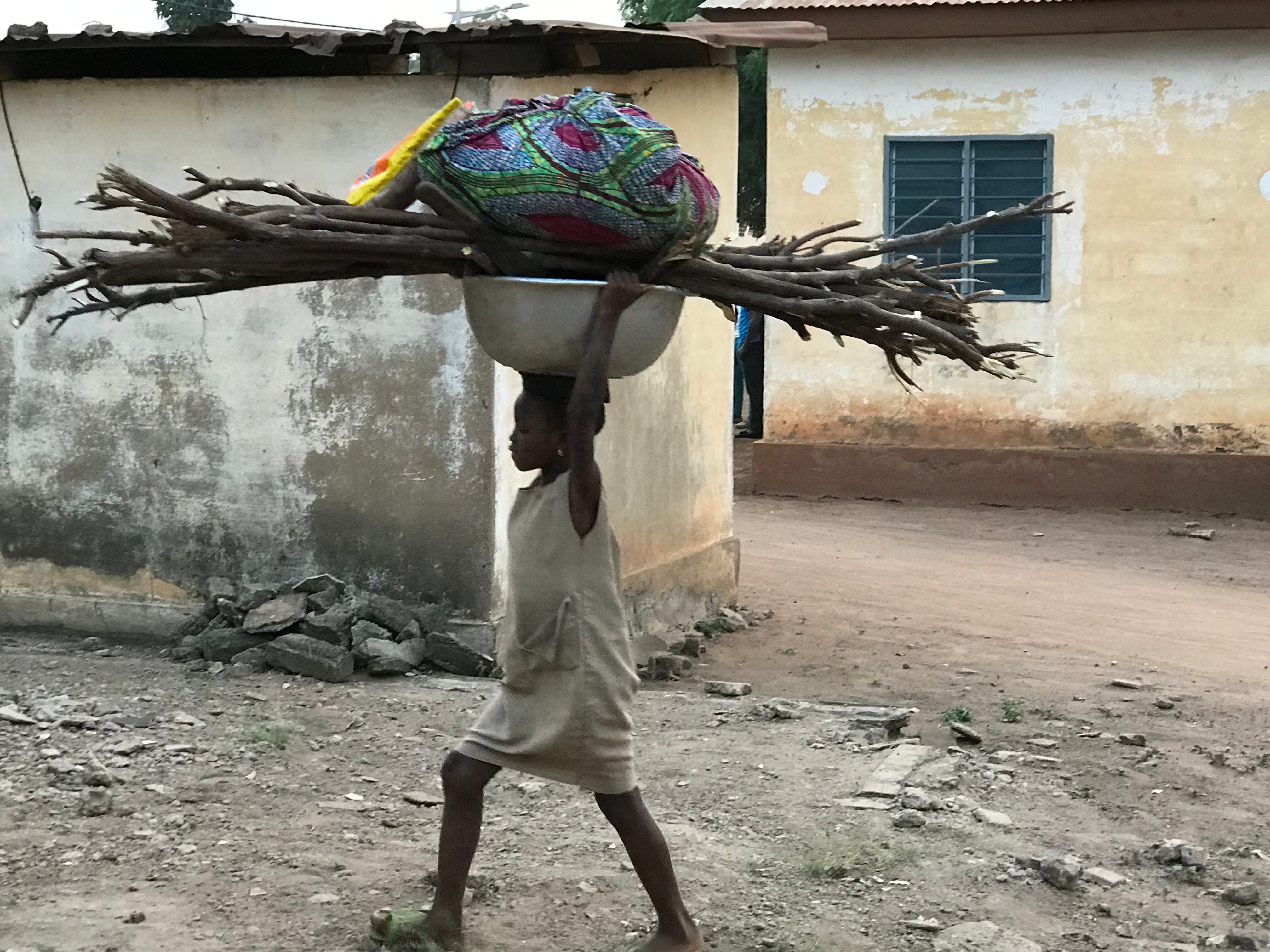 Togo, Africa. A young girl walking home at the end of the day.